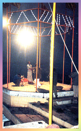 Bu kutsal Ganj nehrinde insanlar hergün yıkanırlar. Varanasi'de gün doğumu törenleri her sabah gün doğmadan önce yapılır. Karanlık ve dar sokaklardan geçilerek gidilen tören alanı tek ışıklı yerdir. Yüksek bir alanda gün doğmadan çanlar çalmaya başlar. Bu karanlık ve ürkütücü sessizlik içinde duyulan çan sesleri insanlarda manevi duyguların yoğunlaşmasına neden olur. Gün doğumu yaklaştığı sırada bu töreni idare eden ailenin büyük oğlu güneşin ters istikametinde yukarıdan aşağı su doker. Daha sonra ya suya girerek yada sandalla açılarak dualarını yaparlar.